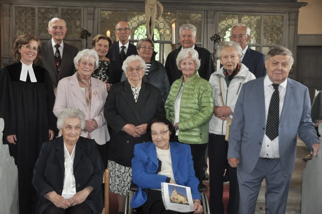 Eyrichshof. 35 Frauen und Männer aus der Kirchengemeinde Eyrichshof haben am Sonntag, 25. Mai, in der Schloßkirche in Eyrichshof das Fest der Jubelkonfirmation gefeiert. Mit dabei waren die Jahrgänge, die vor 75 Jahren zum ersten Mal zum Tisch des Herrn gegangen waren, bis zu denen vor 60 Jahren. Den Festgottesdienst hielt Pfarrerin Lena Gleußner, musikalisch wurde er vom Posaunenchor Fischbach und von Dekanatskantor Matthias Göttermann an der Orgel gestaltet.