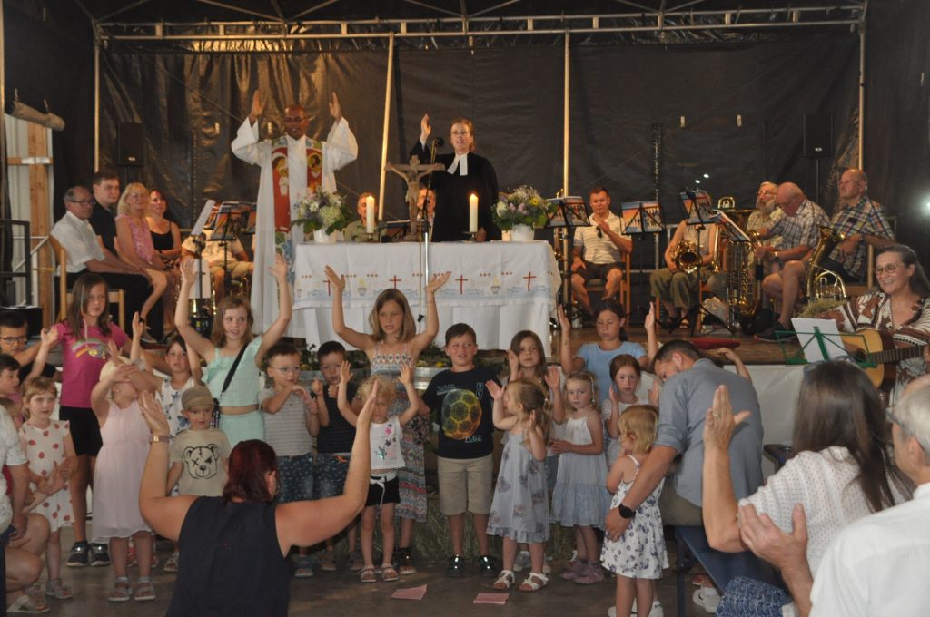 Beim Hoffest der Familie Rügheimer vom Vier-Burgenblick-Hof am Sontag, 29. Juni, fand ein ökumenischer Familiengottesdienst statt, den Pfarrerin Lena Gleußner (im Bild oben Mitte) und ihr katholischer Amtskollege Pater Sinto George (daneben) eindrucksvoll in der Festscheune zelebrierten. Die Kinder vom Kindergarten Pfiffikus Pfarrweisach (im Bild vorne) bereicherten den Gottesdienst mit Liedern und einem Märchen, das Erzieherin Marion Schleicher zum Gottesdienst-Thema Salz vortrug. „Salz“ war auch das Thema des Gottesdienstes – „Ihr seid das Salz der Erde“ (Matthäus 5, 13-16). Der Posaunenchor Fischbach – unterstützt von Bläsern vom Posaunenchor Hafenpreppch – sorgte für die musikalische Gestaltung.