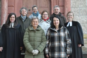 Pfarrerin Eszter Manke-Lackner, Dr. Katharina Mußmächer, Elke Zimmermann, Beate Giebfried, Sieglinde Bühling (Vertrauensfrau), Heidrun Ender, Werner Will (Vertrauensmann) und Pfarrerin Lena Gleußner.